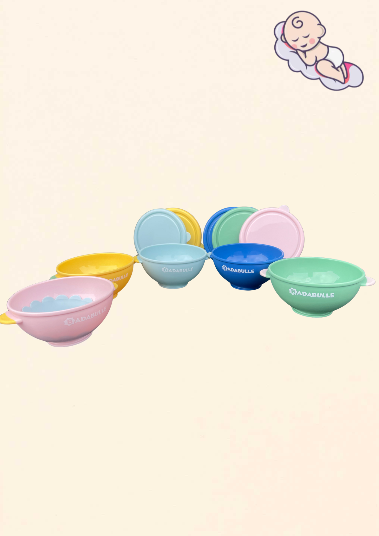 A BADABULLE 5 részes baba étkészlet minden szempontból praktikus és átgondolt megoldás a hozzátáplálás kezdetétől.