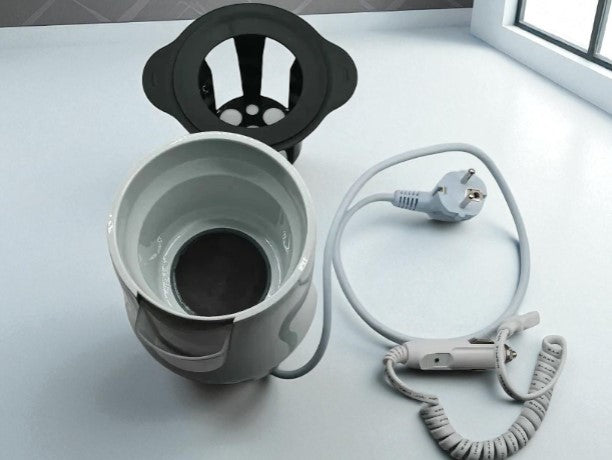 A készülékhez egy hálózati csatlakozó és egy kihúzható kábel is tartozik, amely szivargyújtón keresztül autóban is használható. Ez különösen hasznos lehet hosszabb utakon, amikor nincs lehetőség mikrohullámú sütő vagy konyhai melegítő használatára, mégis szükség van megbízható és gyors megoldásra.